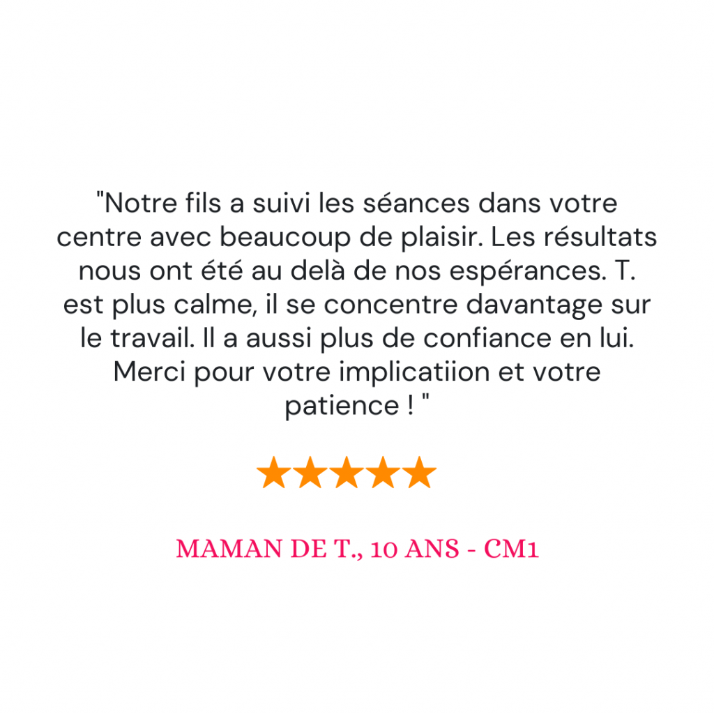 Publié sur Kevin AtuyerTrustindex vérifie que la source originale de l'avis est Google. 2 sessions effectuées avec Madame Condamin pour une pathologie particulière. J'ai fortement apprécié l'honnêteté, la clarté, la patience, et le côté humain de Madame Condamin. Les résultats restent mitigés, mais cela avait été annoncé dès le départ selon ma pathologie. Je ne peux que recommander cette personne. Merci pour tout.Publié sur cjlTrustindex vérifie que la source originale de l'avis est Google. J'ai suivi 2 sessions Tomatis avec Caroline Condamin pour une baisse de mon audition et des acouphènes. Ebéniste à la retraite, je souffre depuis des années de mes acouphènes. J'ai été bien soulagé surtout après la 2ème session. J'ai redécouvert certains sons que j'avais perdu (tic tac de l'horloge, le réveil de ma montre que je n'entendais absolument plus sonner, c'est mon entourage qui me disait qu'elle sonnait). Je n'ai plus de montée en puissance de mes acouphènes et du coup j'ai l'impression de ne plus les avoir même s'ils sont toujours présents quand je me concentre dessus. Les conversations sont beaucoup plus agréables, moins confuses. Je fais beaucoup moins répéter. Très septique au début, je suis plus que satisfait de l'évolution. Je reviendrai volontiers faire une nouvelle série cette année.Publié sur Martine SalleronTrustindex vérifie que la source originale de l'avis est Google. Très bon lieu et praticienne d'une gentillesse et d'une attention pleines de délicatesse. Stage bienfaisant et ayant permis de maintenir mon niveau d'auditionPublié sur Giulia D.Trustindex vérifie que la source originale de l'avis est Google. Bonjour, Caroline a suivi mon mari pour plusieurs sessions Tomatis. Suite à son AVC, il y a 4 ans, mon mari a gardé des séquelles au niveau de la mémoire, de la concentration et de l'attention. Il avait également beaucoup des difficultés pour la marche. Je dois avouer que suite à la thérapie de tomatis ses progrès étaient époustouflants : il arrive à se souvenir davantage. Ses progrès ont été constatés par son orthophoniste aussi. Dernièrement, on s'aperçoit que les douleurs physiques ont diminués. Franchement je peux que remercier infiniment Caroline. Je la conseille vivement Merci Caroline !!!!; Giulia DragomirPublié sur Humbert de NicolayTrustindex vérifie que la source originale de l'avis est Google. J’ai suivi une thérapie d’écoute tomatis positive, saine et adaptée à mon profil dans un cas d’hyperacousie, avec Caroline Condamin. Elle est attentive au soin et à l’écoute de chacun de ses clients, dans une petite structure indépendante. Je suis suffisamment satisfait.Publié sur christel collongesTrustindex vérifie que la source originale de l'avis est Google. Je recommande fortement cette personne qui propose un accompagnement scolaire de très grande qualité adapté aux enfants en difficultés. J’ai eu le plaisir de rencontrer Caroline qui est douce, à l’écoute, bienveillante et surtout très pédagogue. Elle a su adapter son soutien en fonction des difficultés de ma fille avec patience et dévouement. Un grand merci à Caroline qui a réussi à lui redonner confiance en elle afin qu’elle puisse s’épanouir et réussir dans son cursus scolaire et seulement en l'espace de 3 mois, ! Vous pouvez lui faire confiance les yeux fermés. Je mettrais avec plaisir mes autres enfants si besoin. Merci pour votre aide précieuse. Mille merci ChristelPublié sur 06imaneTrustindex vérifie que la source originale de l'avis est Google. Mme Condamin a su faire preuve de beaucoup patience et de bienveillance au cours de l'accompagnement avec mon fils. Nous avons constaté une amélioration dans son comportement notamment dans la concentration. Concernant la dysgraphie, il force moins sur le stylo ce qui lui facilite déjà bien l'écriture. A voir dans le futur si besoin d'une 3ème session.
