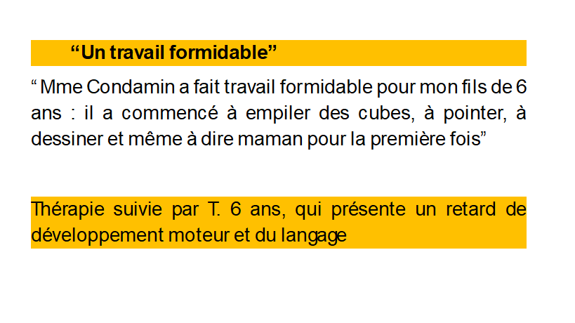 Publié sur H&W BlakeTrustindex vérifie que la source originale de l'avis est Google. Nous avons deux de nos enfants qui ont bénéficié des séances Tomatis avec Caroline Condamin. Et pour les deux, nous appréhendions l’intensité des séances mais ce ne fut absolument pas un problème. Ils y allaient avec plaisir et ce n’est finalement pas plus fatiguant que des séances orthophonistes qui traînent dans la temps et demandent aux parents une adaptation de leur emploi du temps. Notre fils âgé de 11 ans aujourd’hui a fait les séances il y a 2 ans. Il était dans une période très difficile, des troubles dys et une enseignante qui l’avait encore plus découragé. Il avait un fond très mélancolique et était en échec scolaire. 3 sessions on été nécessaire et furent très efficaces. Aujourd’hui il réussi sur le plan scolaire et a retrouvé sa joie enfantine. Le TDA qu’on avait commencé à nous suggérer n’est plus à l’ordre du jour. Son frère âgé de 16 ans a fait ses séances début 2025. Il a une déficience intellectuelle, des troubles du comportement et a beaucoup de mal à gérer ses émotions. Il est en IME. Il a beaucoup aimé les séances, et depuis est plus apaisé. Son oreille droite qui a subit beaucoup d’otite a retrouvé une meilleur audition. Nous avons été surpris de l’adaptation dès séances aux problématiques de nos enfants. Nous envisageons même de faire des séances pour nous mêmes ou nos autres enfants tellement nous avons trouvé cela bluffant. Nous recommandons cette méthode sans hésitation. Quelle chance d’avoir trouvé une méthode efficace dans traitement chimique… H.BPublié sur Roowda HandulleTrustindex vérifie que la source originale de l'avis est Google. Ayant un enfant TSA avec hyperactivité motrice,un gros retard de langage (pas propre à ce moment la) la thérapie l’à beaucoup aidé. À chaque période où il fessait TOMATIS , il y avait toujours un mieux , un mot de gagné , puis 2 ensuite 3 puis construction de phrase …etc après la première période il est devenu propre la journée sauf pendant la sieste et la nuit , après la 2eme période il est devenu propre la journée (sieste inclu) sauf la nuit , réellement je ne saurais vous dire quoi d’autre que cette thérapie est vraiment essentiel et marche pour les enfants mal entendant , trouble du comportement , retard de langage …etc je remercie Madame Caroline CONDAMIN sur Lyon et Monsieur Patrick DELAROQUE infiniment car si mon fils a évolué dans sa progression c’est bien grâce à eux.Publié sur Timo ThéeTrustindex vérifie que la source originale de l'avis est Google. Mme Condamin a fait un travail formidable pour mon fils de 6 ans qui a un retard de développement et ne parle pas encore. En 3 sessions, il a fait de grands progrès, il a commencé à empiler des cubes, à pointer, à dessiner et même à dire "maman" pour la première fois. J'ai beaucoup apprécié la douceur et la précision de Mme Condamin, on se sent entre de bonnes mains ! Je la recommande vivement.Publié sur Carine S.Trustindex vérifie que la source originale de l'avis est Google. Caroline est une grande professionnelle, très à l’écoute, investie, patiente et sa méthode Tomatis mérite vraiment d’être connue. Le bilan effectué m’a permis de nombreuses compréhensions. Je vous recommande vivement ses services et un grand merci Caroline ! 🙏🏻🤗Publié sur Kevin AtuyerTrustindex vérifie que la source originale de l'avis est Google. 2 sessions effectuées avec Madame Condamin pour une pathologie particulière. J'ai fortement apprécié l'honnêteté, la clarté, la patience, et le côté humain de Madame Condamin. Les résultats restent mitigés, mais cela avait été annoncé dès le départ selon ma pathologie. Je ne peux que recommander cette personne. Merci pour tout.Publié sur cjlTrustindex vérifie que la source originale de l'avis est Google. J'ai suivi 2 sessions Tomatis avec Caroline Condamin pour une baisse de mon audition et des acouphènes. Ebéniste à la retraite, je souffre depuis des années de mes acouphènes. J'ai été bien soulagé surtout après la 2ème session. J'ai redécouvert certains sons que j'avais perdu (tic tac de l'horloge, le réveil de ma montre que je n'entendais absolument plus sonner, c'est mon entourage qui me disait qu'elle sonnait). Je n'ai plus de montée en puissance de mes acouphènes et du coup j'ai l'impression de ne plus les avoir même s'ils sont toujours présents quand je me concentre dessus. Les conversations sont beaucoup plus agréables, moins confuses. Je fais beaucoup moins répéter. Très septique au début, je suis plus que satisfait de l'évolution. Je reviendrai volontiers faire une nouvelle série cette année.Publié sur Martine SalleronTrustindex vérifie que la source originale de l'avis est Google. Très bon lieu et praticienne d'une gentillesse et d'une attention pleines de délicatesse. Stage bienfaisant et ayant permis de maintenir mon niveau d'auditionPublié sur Giulia D.Trustindex vérifie que la source originale de l'avis est Google. Bonjour, Caroline a suivi mon mari pour plusieurs sessions Tomatis. Suite à son AVC, il y a 4 ans, mon mari a gardé des séquelles au niveau de la mémoire, de la concentration et de l'attention. Il avait également beaucoup des difficultés pour la marche. Je dois avouer que suite à la thérapie de tomatis ses progrès étaient époustouflants : il arrive à se souvenir davantage. Ses progrès ont été constatés par son orthophoniste aussi. Dernièrement, on s'aperçoit que les douleurs physiques ont diminués. Franchement je peux que remercier infiniment Caroline. Je la conseille vivement Merci Caroline !!!!; Giulia DragomirPublié sur Humbert de NicolayTrustindex vérifie que la source originale de l'avis est Google. J’ai suivi une thérapie d’écoute tomatis positive, saine et adaptée à mon profil dans un cas d’hyperacousie, avec 